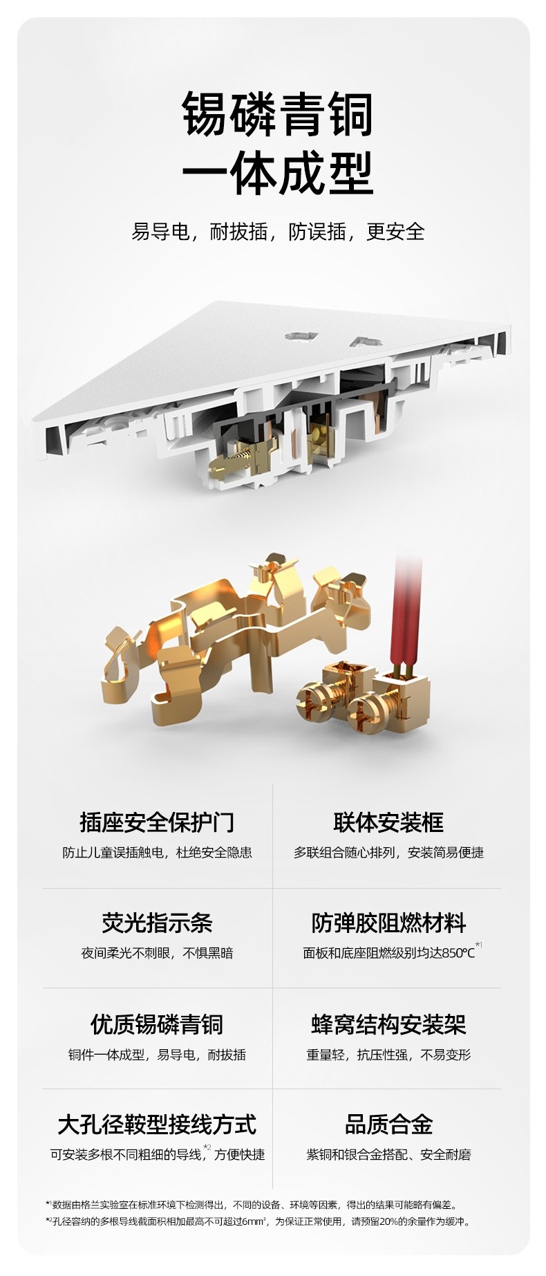 開關(guān)插座是家庭用電安全的后一道防線,因此開關(guān)插座的安全性不容忽視。E6系列精選導(dǎo)電寬度達3.8mm的錫磷青銅,導(dǎo)電快,性能好,不易變形更耐用。塑料件選用全新型進口PC材料,1.8mm厚度面板,高溫阻燃、不易變形、易清潔;高密度高強度使用安全又長久。