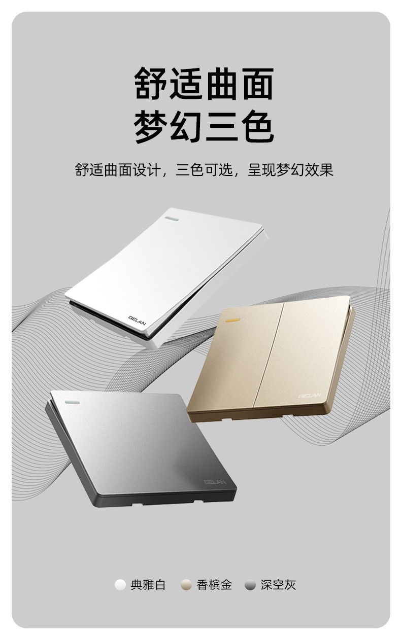 近幾年,家居流行風(fēng)尚回歸自然、質(zhì)樸,越來越多的人開始崇尚這種“即少是多”的美學(xué)理念,簡約的家居設(shè)計使人感到放松更符合都市年輕人的生活品位。GELAN格蘭電氣作為行業(yè)的佼佼者,一直引領(lǐng)行業(yè)發(fā)展潮流,不斷追求新的高度。GELAN格蘭電氣本期新品E6大板開關(guān)插座,將帶給你全新的視覺、觸覺,讓你的生活變得與眾不同。