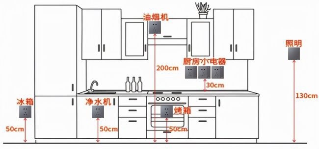 剩下的4個插座則是安裝在必不可少的位置,冰箱、凈水機、油煙機和烤箱都需要插座。