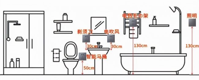 洗臉池斜上方裝1個插座,供電熱水器或電熱毛巾架的用電需求。